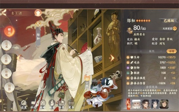 郑和属于群体输出型名士,核心机制围绕“骇浪”叠层与“宝船”护盾展开。
