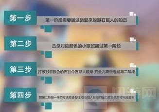 1,石巨人在第一阶段只会露出上半身和两只手,当石巨人拍击地面的时候,注意及时跳起来躲避,石巨人有三个小跟班,需要根据石巨人肚子上的颜色攻击相应的小跟班。