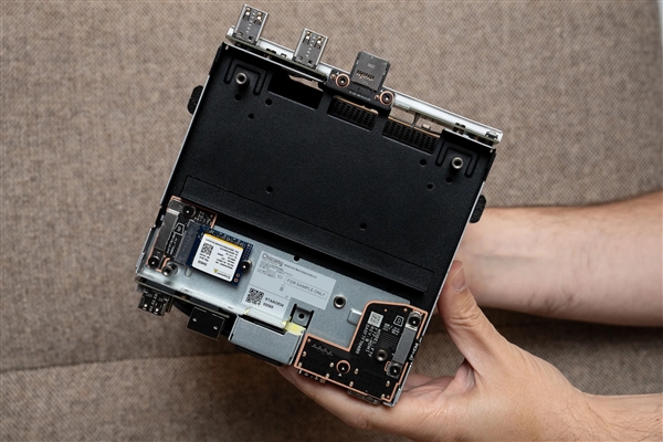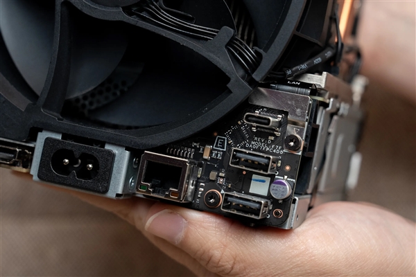 更令人称道的是,V社还设法在这个3.8升的黑匣子里赛下了电源适配器,游戏机外部大小只有PS5的二分之一,秘诀是高度定制化的风冷系统,所有零件围绕这个120毫米静音风扇进行布置,没有浪费任何空间。