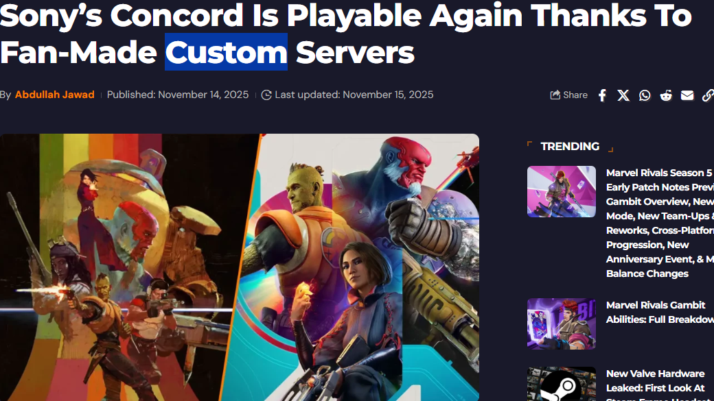 据悉一个高玩组织早先公布了"Concord Delta"项目,实际上就是私自搭建的玩家服务器,目前并没有证据显示也不太可能有索尼互娱的官方授权,11月14日突然兴奋的宣布"Concord Delta"私建服务器已经测试通过可以运行,同时发布了宣传片引发热议。