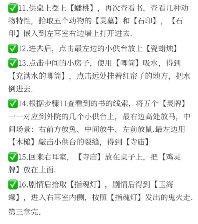 11.敲击左侧供台裂缝获得【寺庙】道具,与【鸡灵牌】组合触发剧情,最终用【指魂灯】引导鬼火完成章节。