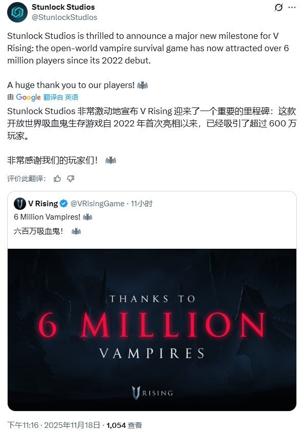 Stunlock Studios首席执行官Rickard Frisegård在庆祝公告中表示:“达到600万玩家对我们所有人来说都是非凡时刻。这个里程碑凝聚了数年的激情投入,也体现了社区玩家自游戏发售以来给予的不懈支持。”
