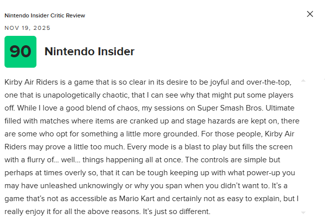 《星之卡比:空中骑士》是一款充满了"想要带给玩家纯粹快乐、夸张体验"的游戏,它毫不掩饰地混乱、热闹,所以我也理解为什么有些玩家可能会被它劝退。虽然我个人非常喜欢这种混乱与欢乐的混合——就像在《任天堂明星大乱斗特别版》中把道具开到最大、场景陷阱全开那样的对局——但也有人更偏好更"落地"、更可控的体验。对这些玩家来说,《星之卡比:空中骑士》可能就显得有点"太过头"。