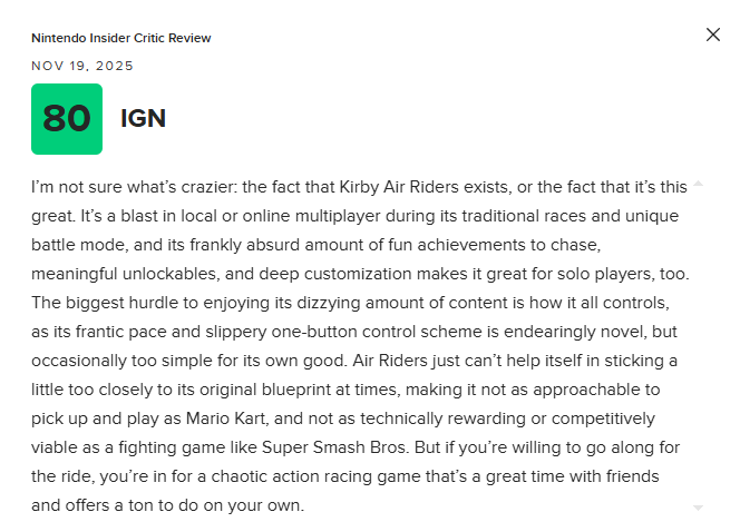 享受这款游戏内容繁多的最大障碍在于操作——它那紧张刺激的节奏和单键操作虽然新颖又讨喜,但有时也显得过于简单。Air Riders有时会过于忠于原作的设计蓝图,这让它不像《马力欧赛车》那样易于上手,也不像《任天堂明星大乱斗》那样在技术性或竞技性上有明显回报。但如果你愿意跟随它的节奏,你将体验到一款混乱却极具乐趣的动作竞速游戏:和朋友一起玩很嗨,单人游玩也能有大量事情可做。
