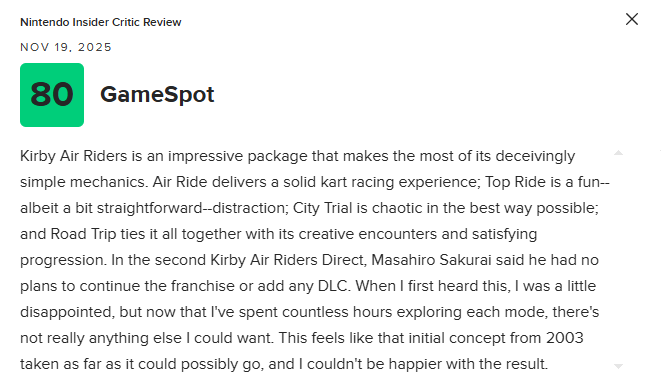 在第二次《星之卡比:空中骑士》直面会上,樱井政博表示他没有计划继续拓展这一系列,也不会推出任何DLC。起初听到这个消息时,我还有些失望,但在投入大量时间探索每一种模式后,我发现自己几乎不再有其他期待。这款游戏就像是2003年最初概念的极致实现,而我对最终呈现的结果感到无比满意。