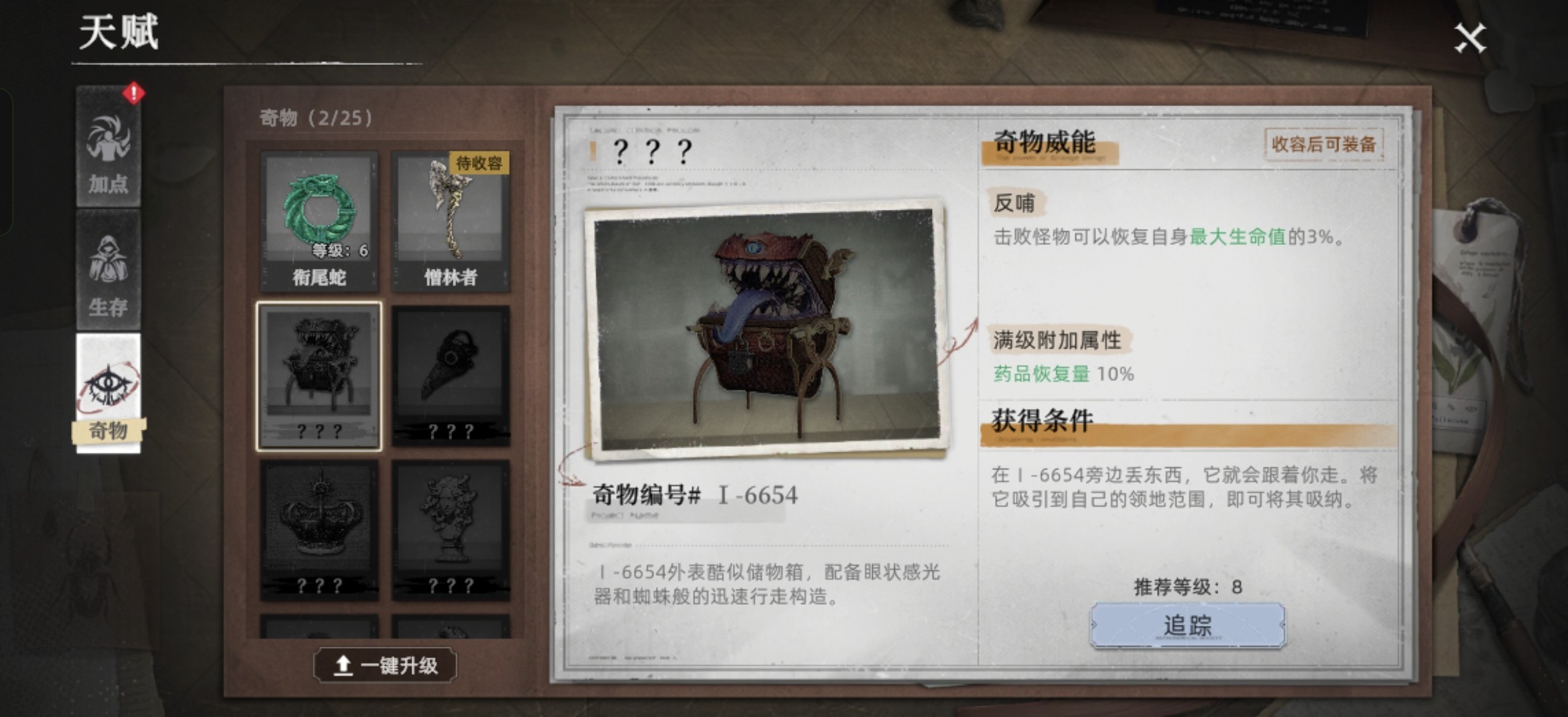 在实战中发现,将暴击系天赋与狩猎系天赋组合使用时,能显著提升野外生存效率。特别是在夜间时段,配合特定奇物的加成效果,可形成独特的"夜猎者"流派。建议优先解锁"致命精准"和"荒野直觉"两个核心天赋节点。