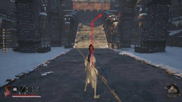 1、从【云顶城-雪堡主堡】的神龛出发,向前沿主楼梯右转进入雪堡主堡