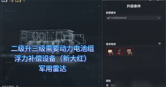 升级材料:动力电池组1、浮力补偿设备1、军用雷达1。这些材料较为稀有,获取难度颇高。