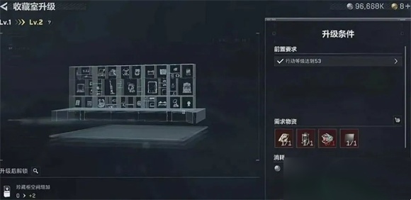 升级效果为收藏柜空间增加49,展示台空间增加20。这为玩家提供了更多展示珍贵藏品的空间,方便整理和陈列从局内搜集到的各类物品。