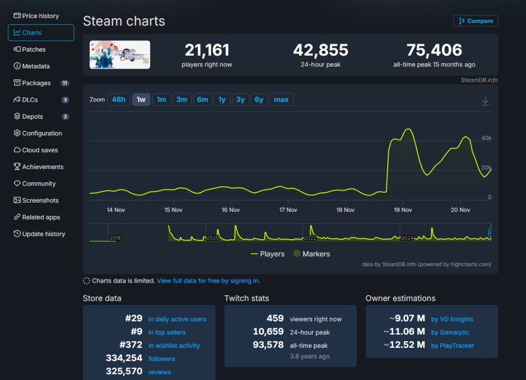 截至撰稿时,DLC"合金意念"已收获约1400条评价,96%好评率的"好评如潮"认证彰显其品质。游戏本身的Steam同时在线玩家数量也大幅飙升,DLC发布当天峰值超过48000人(SteamDB数据)。