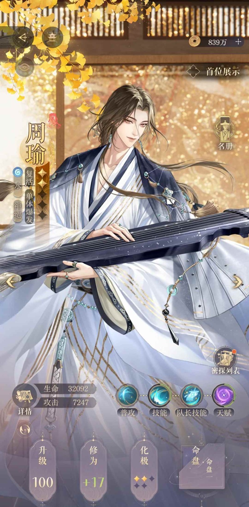 实战中发现,当周瑜的七弦音叠加到第三层时,其爆发伤害能提升约40%。建议在第二回合结束时,确保干吉血量控制在周瑜大招斩杀线内。若输出不足,可调整贾诩和令狐茂的命盘,优先选择暴击率加成属性。