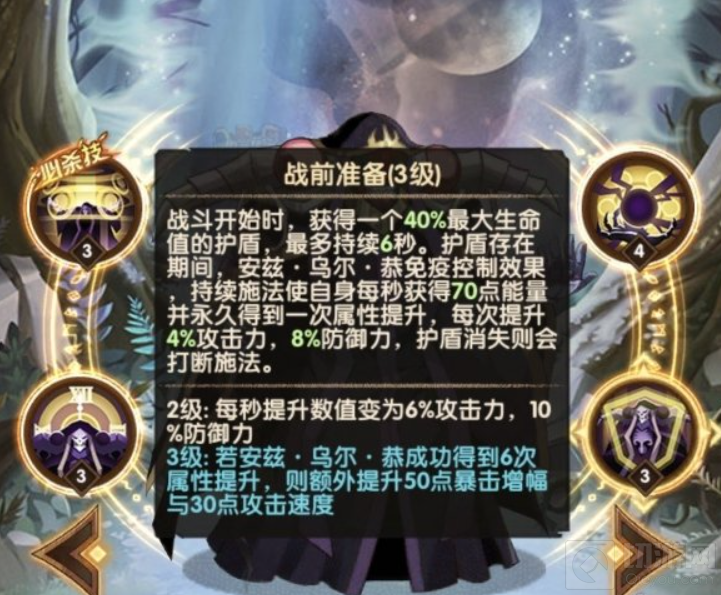 在战斗开始时,获得一个相当于你最大生命值 40% 的护盾,持续最多 6 秒。护盾存在期间,安兹乌尔恭免疫控制效果,持续施法每秒获得70能量和永久属性提升,每次最多增加6%的攻击力和10%的防御力,并且护盾消失会打断施法。 3级:如果安兹乌尔恭成功获得6点属性提升,将额外增加50点暴击提升和30点攻击速度。