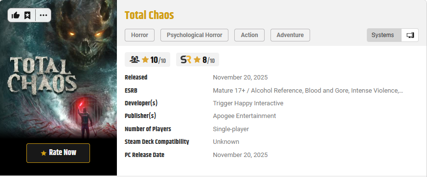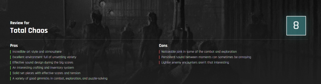 《Total Chaos》对我来说是一款充满极致对比的作品。我十分欣赏它的战斗与生存设定,但实际与普通敌人进行近身格斗和枪战时,体验却未达预期。游戏中存在的一些明显粗糙之处,也削弱了其优秀元素的感染力。然而,游戏的场景构建、环境氛围与音效设计却始终令我着迷。其中那些规模更大的恐怖桥段及其层层铺垫尤为出色。像这样从《Turbo Overkill》到《Total Chaos》实现主题巨变的游戏并不多见,但我认为Trigger Happy Interactive确实借此打造出了一部相当有趣的作品。它或许表现不稳,但当《Total Chaos》真正发力时,其冲击力犹如一柄重锤,狠狠砸向我们那已扭曲错乱的理智。