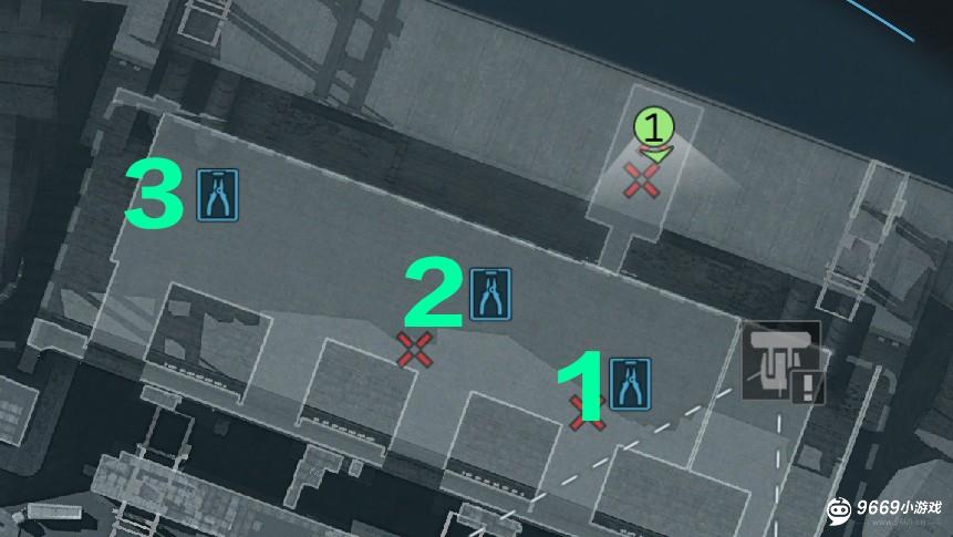 3号炸弹:设置在大坝内部最西侧的蓝色装置上,行进时注意脚下积水区域,避免发出异响。