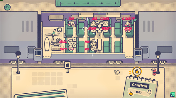 通过观察乘客位置变化规律可以发现,空调开关状态直接影响特定座位的可占用性。建议玩家在操作时注意角色之间的关联性,部分NPC的移动轨迹会暗示后续阶段的解谜方向。