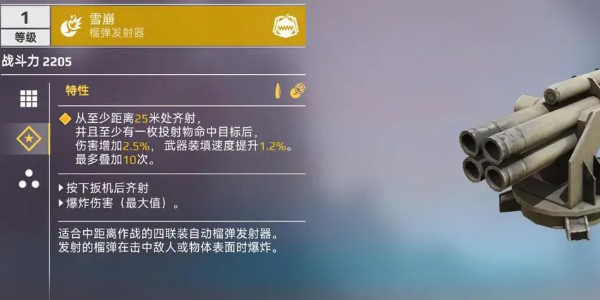 雪崩采用平射弹道设计,四枚榴弹以近似火箭弹的轨迹飞行。其独特的碰撞引爆机制确保弹药在任何情况下都能发挥威力,即便是空中自毁也能产生范围伤害。