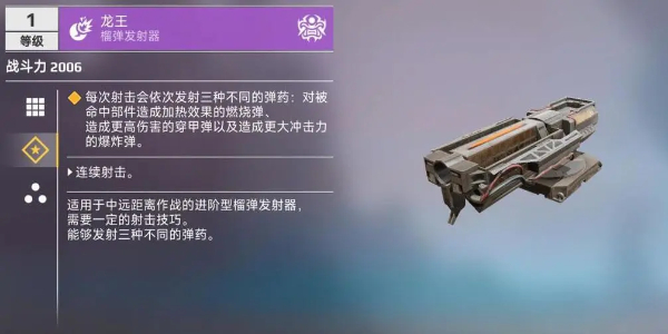作为最先进的多功能发射器,龙王配备三色弹药系统:橙色燃烧弹造成持续伤害,红色穿甲弹专攻重型装甲,蓝色爆炸弹产生巨大冲击波。五连发的爆发设计使其成为战术多面手。