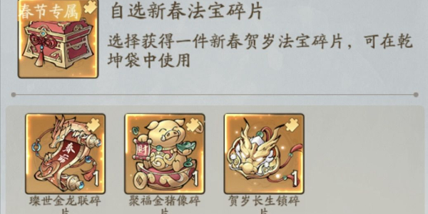 层数奖励中,还有自选新春法宝碎片——璨世金龙联碎片、聚福金猪像碎片、贺岁长生锁碎片。集齐这三个传说法宝即可激活套装【新春贺岁】,获得生命加成。