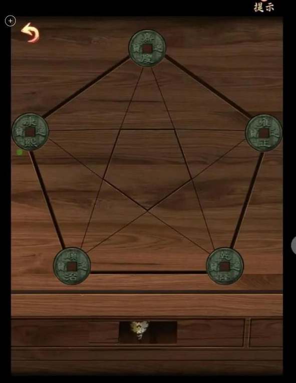 9、返回庭院进入左侧房间,点击房间中的衣柜,按照提示完成图案解密,打开衣柜可以获得【顺治铜钱】