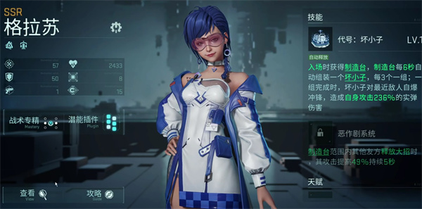 是游戏内的工程型输出角色,同时兼备召唤组装的技能,在配备了"坏小子"机器人后,可以对最近的敌人单位造成自爆伤害,该伤害为真实伤害,且基于自身攻击倍率236%进行数值转化。