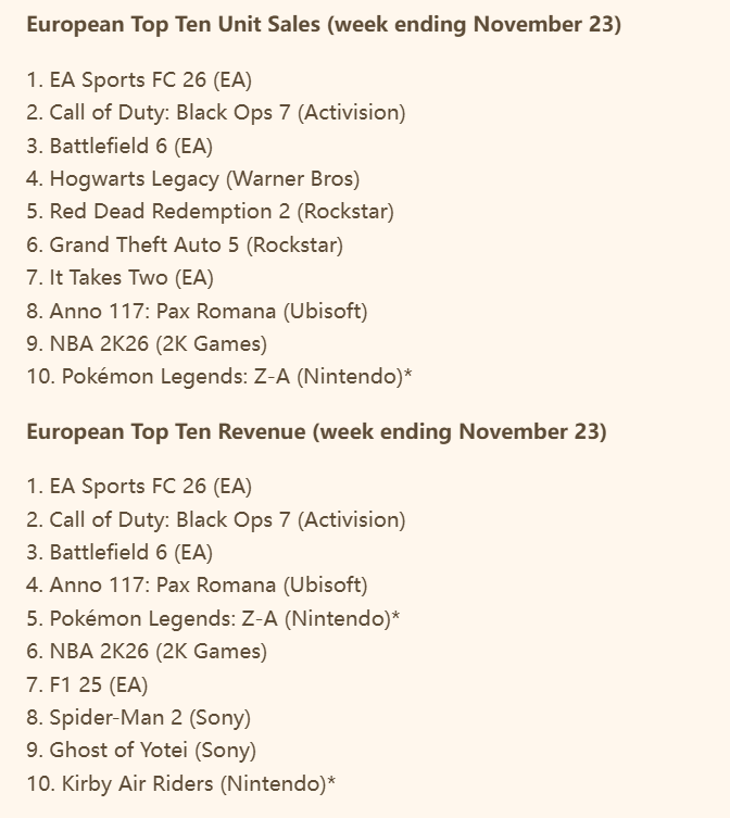 以上就是小编为大家带来的欧洲游戏市场周报全部内容,更多精彩资讯请持续关注本站。