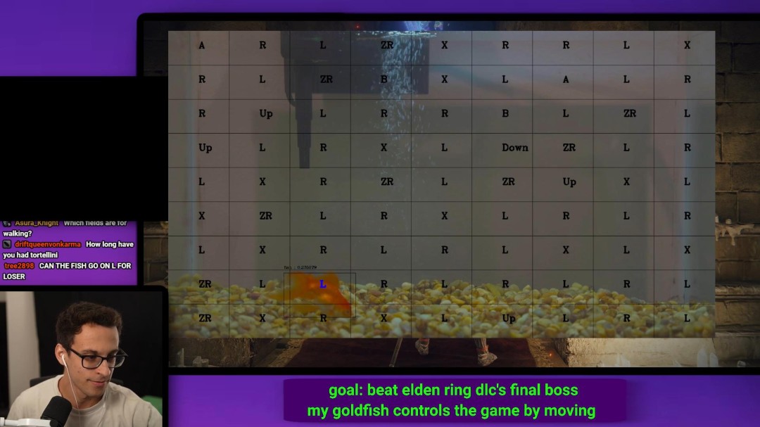 PointCrow使用了一套可以利用镜头追踪金鱼位置的映射设备,将鱼缸划分成9X9的大型九宫格区域,再在其上设定好对应按键指令,便开始了挑战,在耗时8个小时,共计94次尝试后,终于顺利击败《艾尔登之王:黄金树幽影》的最终BOSS拉塔恩,完成了这一壮举。