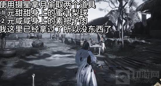 触发任务后需要使用特殊技能"摄星拿月"获取三件关键物品:元甜甜处的肉香小锅、说书人背后的箱子,以及元大姐保管的离乡小罐。每件物品的获取都需要精准操作和时机把握。