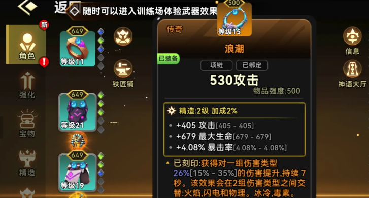 在衣服上面可以选择庇护战袍,获得198防御,还有2525生命。还有每5秒27点生命回复,在投弹之后三秒还能获得15.5%的减伤,生存能力是比较出色的。项链可以用浪潮,有405点固定攻击,还有679最大生命,并且还有4.08%的暴击率。更关键的是刻印效果在交替之后就能提升两种伤害类型26%的伤害,输出提升还是超级明显的。武器方面可以选择黑月单手剑,基础攻资是1298但可以获得15.84%的暗光伤害。
