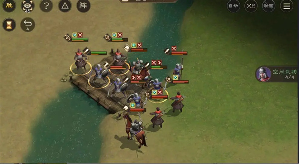 这关我们要利用好桥梁,尽量让我们的士兵少被打,减少被招降的概率。尽量控制前排的士兵血量不要太高,这样敌方回合的时候,打一下我们的士兵被招降了,回复50%血量后,总血量也不会太高,被招降的士兵普攻被我方士兵反击,很容易会再次被招降,这样就可以顺利通关了。