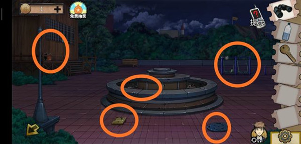 反复点击瓶子获取写有"上上下下左右"的线索纸条。切换至女性角色视角,在公园喷泉旁输入该方向指令获得铁钩。使用铁钩开启井盖并投入望远镜,实现双主角场景的联通。