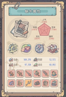 这五个方面的数值。五维中人气是最关键的,因为不少任务解锁都需要蜗牛的人气值到达多少的标准才解锁,所有五维优先点人气值。