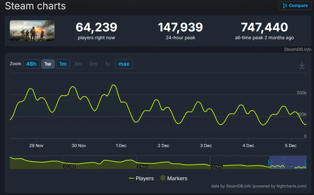 凭借惊人的首发数据与普遍积极的初期评价,《战地6》原本被预期能够长期维持庞大的玩家基数。尽管目前其峰值玩家数仍属可观,但与首发时的盛况相比已相去甚远。