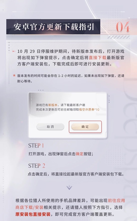 停服维护期间,新版本客户端将陆续发布上架,届时猎人打开游戏即可根据弹窗指引下载最新版本,完成覆盖安装。