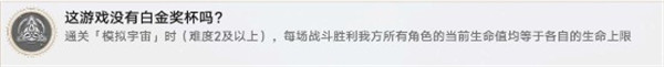 在《崩坏:星穹铁道》的模拟宇宙挑战中,"这游戏没有白金奖杯吗"堪称最考验玩家战术规划的成就之一。该成就要求玩家在全程通关过程中,确保每场战斗胜利时所有队员的生命值必须保持满状态——这不仅需要精准的血量控制能力,更对队伍配置和战斗策略提出了极高要求。下面我们将深入解析这个特殊成就的达成技巧,帮助各位开拓者突破挑战。