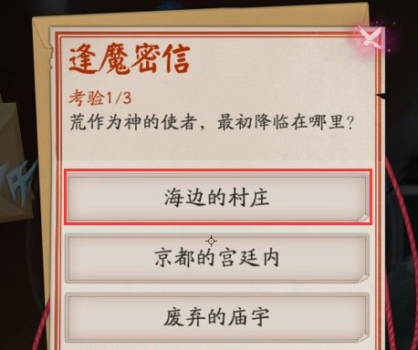 在《阴阳师》的逢魔密信挑战中,有一道关于式神荒的背景故事考题:"荒作为神的使者,最初降临在哪里?"这道看似简单的题目,实则暗藏玄机,需要玩家深入了解荒的起源传说才能准确作答。让我们一同揭开这位神秘使者的身世之谜。