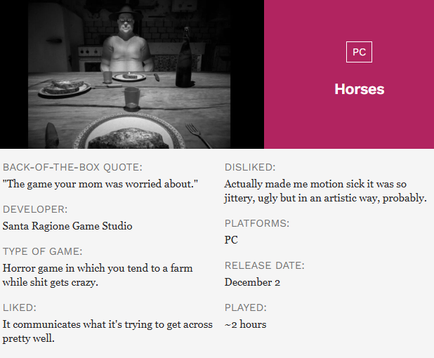 有个片段受批评较多,农场主强迫“马”性侵并敲击贞操带观看,这是游戏最恐怖场景之一,糟糕瞬间多与性暴力有关。但和其他内容一样,我感觉不到背后有深刻意义。 有人批评《Horses》的性暴力是为“刷震撼值”,但暴行出现时能看出其回归到性观念扭曲与农场主心理阴影这一主题。不过理解与欣赏之间仍有距离。