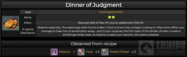 作为角色专属料理,审判的晚宴具有显著的恢复效果:基础可回复30%最大生命值,并额外恢复1750点固定生命值。这种双重恢复机制在当前版本食物中较为罕见,尤其适合高难度副本中的续航需求。