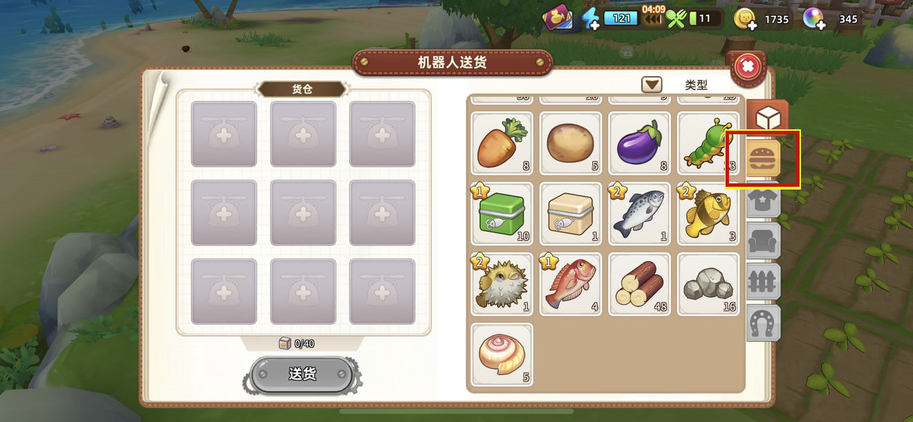 2、椰子属于食物,然后点击图上画框的汉堡图标,就可以出售了,出售完成即可完成生鲜店卖椰子任务。