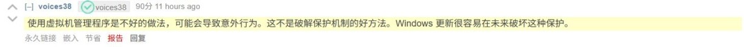 voices38表示:"使用虚拟机管理程序是个糟糕的想法,可能导致不可预测的系统行为。这是一种拙劣的破解方式。未来任何Windows更新都可能轻易破坏这种破解。"