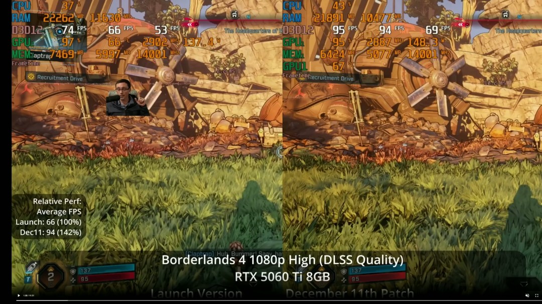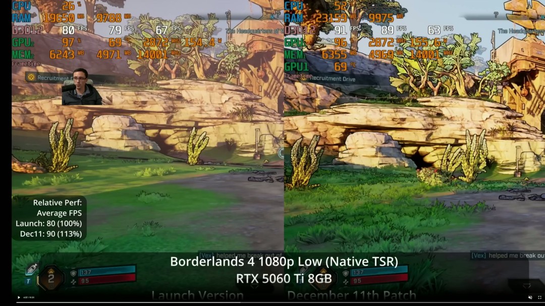 油管频道Daniel Owen测试了此次更新。在配备8GB显存的显卡上,性能提升非常显著。得益于此次更新,现在即使是像RTX 5060Ti 8GB这样的显卡,也能在高画质设置下以更高的帧数运行《无主之地4》。在最高画质设置下,性能几乎可以翻倍。