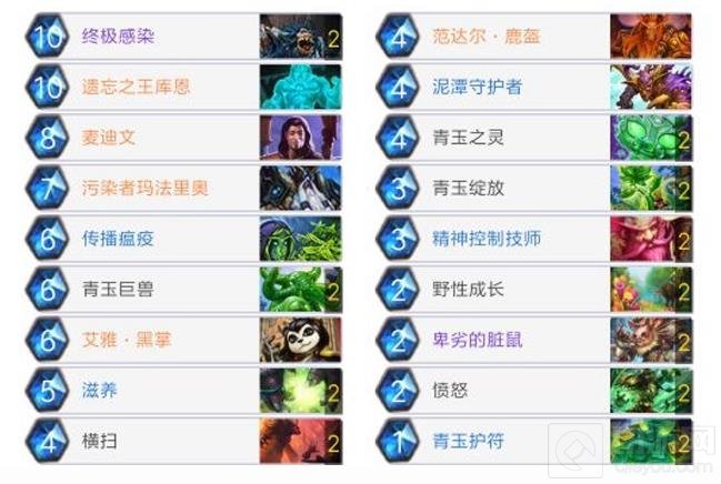 10费用终极感染完成1次铺场加过牌。而后通过手牌优势赚取卡差,最终利用青玉站场优势终结比。而加入双脏鼠以及双130的青玉德。在站场和反场上效果远远好于传统的青玉德。