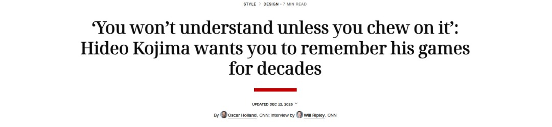 CNN报道称,小岛秀夫的创作理念是"首先找到一个自己能享受其中的项目",至于玩家的体验,则可以稍后再考虑。小岛告诉CNN,游戏开发需要四到五年时间,并且需要投入大量精力,所以"除非我真心热爱它,否则我无法坚持下去"。