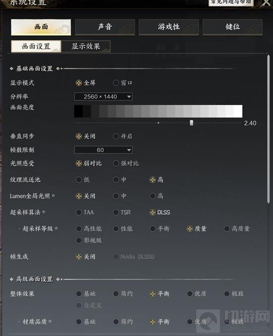 - 材质品质:根据显卡显存容量选择,一般建议"平衡"档位