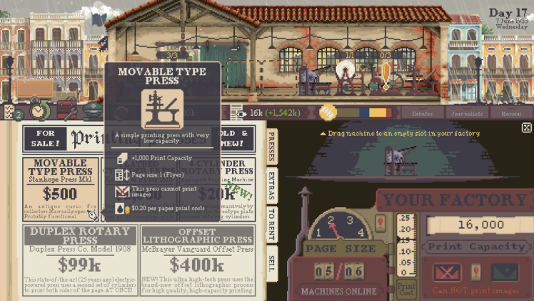 从最简陋的印刷车间起步,你需要不断购置先进设备、扩大产能、提升发行效率,以应对迅速增长的读者需求。随着厂房升级,你将解锁更大纸张、更高印量以及全新的发行策略,在国家14个地区中布局投递路线,找到你的核心读者群。