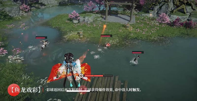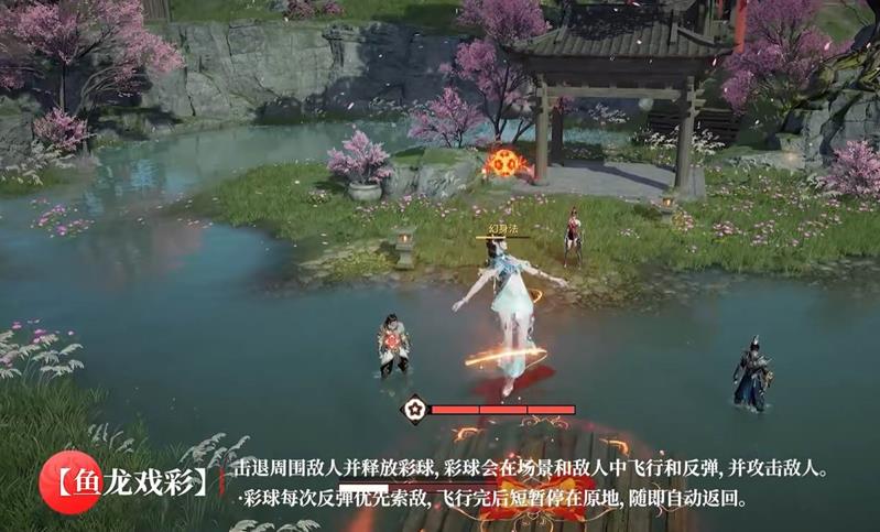 鱼龙彩戏:蓝梦击退周围敌人,以幻身法跃上戏布并释放弹射彩球。彩球会在场景和敌人中飞行和反弹,可攻击敌人并回复自身。