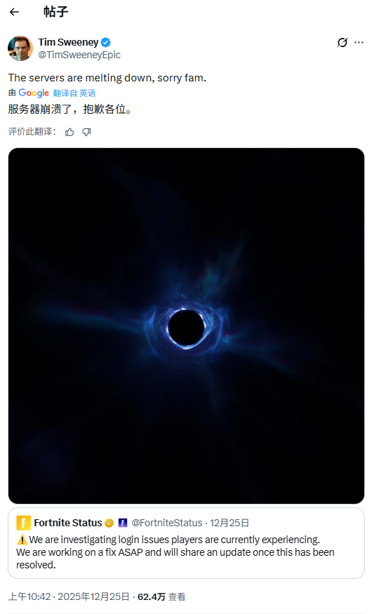 Epic创始人兼CEOTim Sweeney在社交平台发布消息,承认服务器问题,并对玩家表示歉意。在承认问题的帖子中,Tim Sweeney写道:"服务器宕机了,抱歉了家人们。"