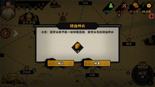 【陨铁】:开局及后每5年出现一次陨铁锻造神兵的机会,至多锻造5次,国家初始及后续每5年获得1个铁,至多5次【若时代没有铁则会替换】