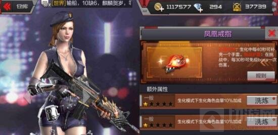 凤凰戒指是首款专为生化模式准备的首饰。"手雷补充"能够使你在生化模式中,每40秒补充一个手雷;除了生化模式加成,"挑战护盾"的特性还能让你在挑战模式中每30秒免疫一次BOSS伤害。