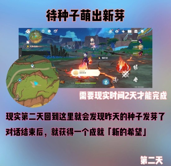 这个成就的设计理念体现了米哈游在任务系统上的创新思考。通过引入现实时间要素,开发者成功打破了虚拟与现实的界限,让玩家在等待种子发芽的过程中,自然联想到生命成长的真实规律。这种设计手法不仅丰富了游戏体验,也巧妙提升了玩家的参与感和期待值。