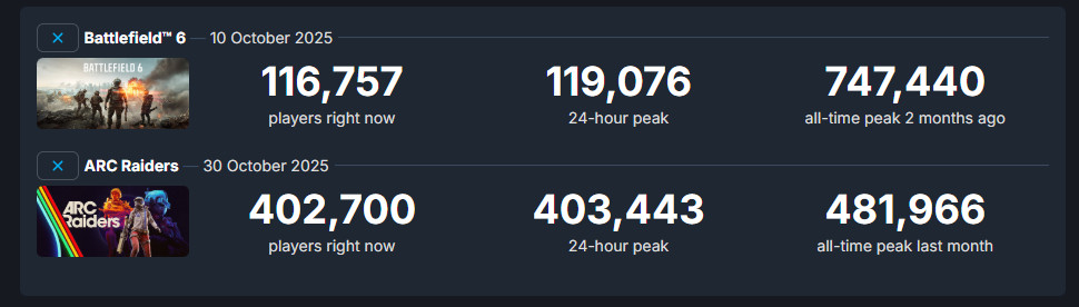 今年10月初发售的《战地6》已经有很多人弃坑,在线从首发的74.7万下降到仅仅11.6万人,而后来居上的《Arc Raiders》稳扎稳打,当前仍超过40万人,超过了首发时的在线数据,和最高在线峰值48.1万相差无几。